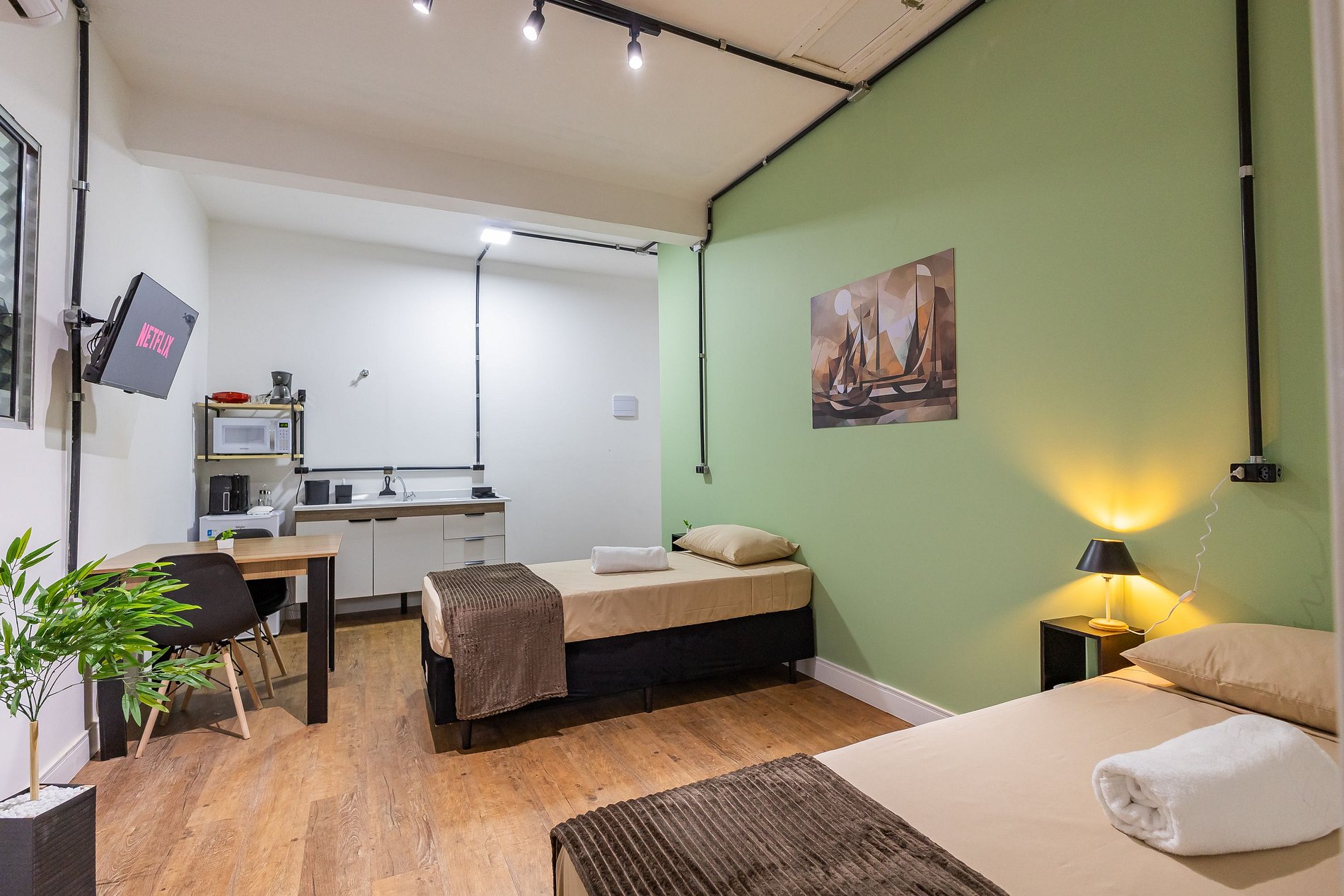 Todos Studios estão no primeiro andar, fácil acesso por escadas. Todos equipados com AR CONDICIONADO ( FRIO/QUENTE) para seu melhor conforto.