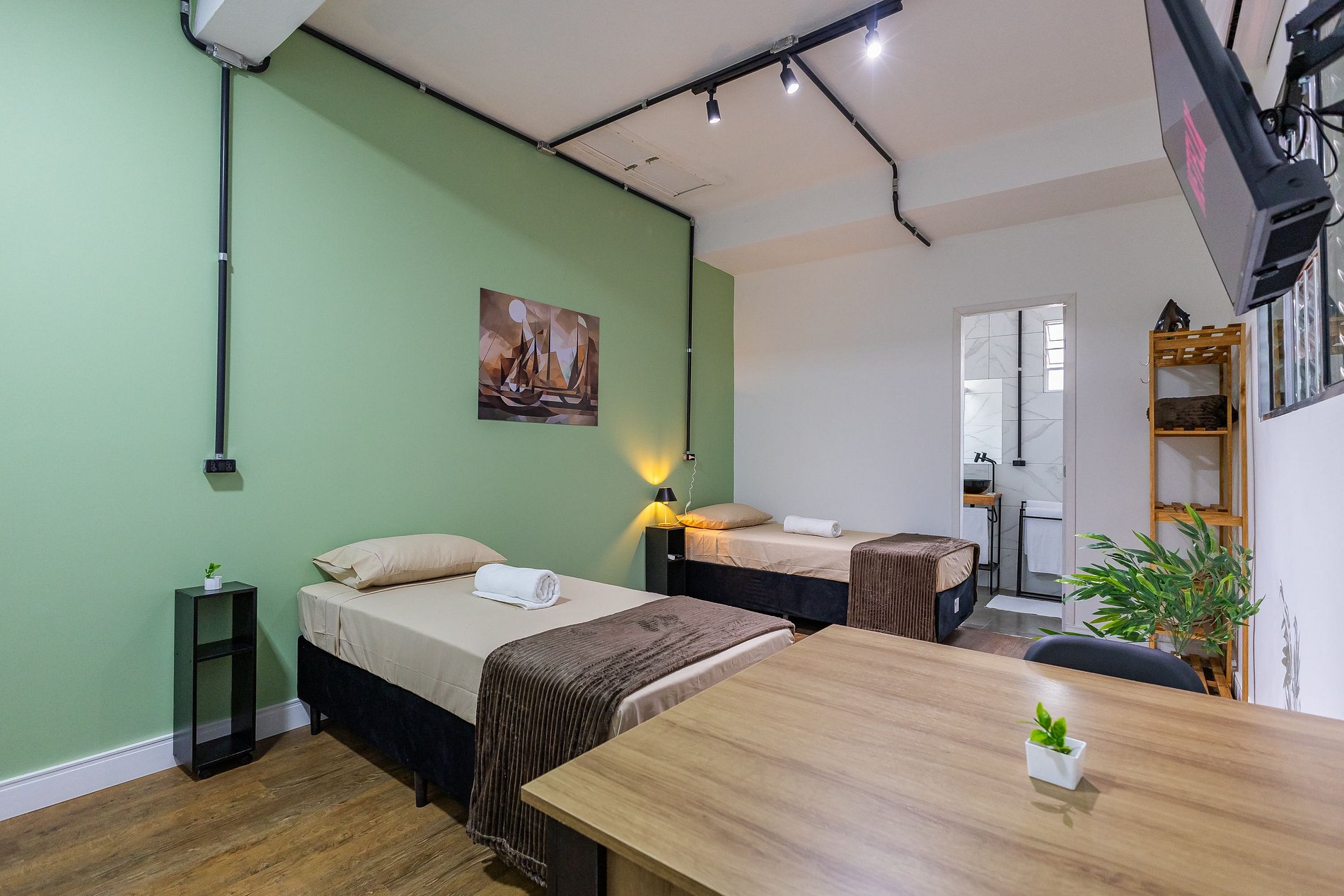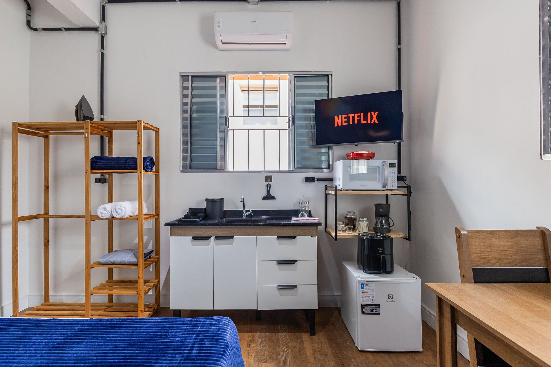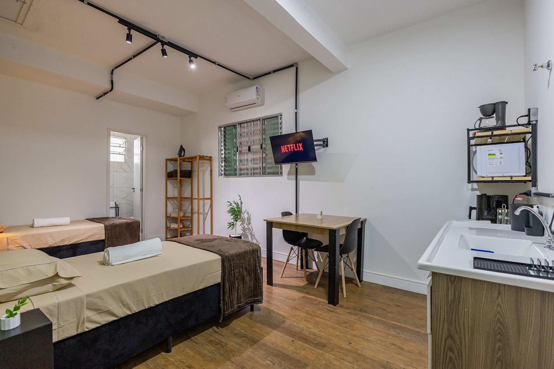 Todos Studios estão no primeiro andar, fácil acesso por escadas. Todos equipados com AR CONDICIONADO ( FRIO/QUENTE) para seu melhor conforto.