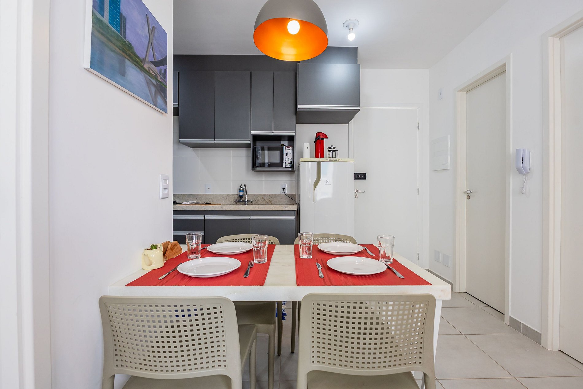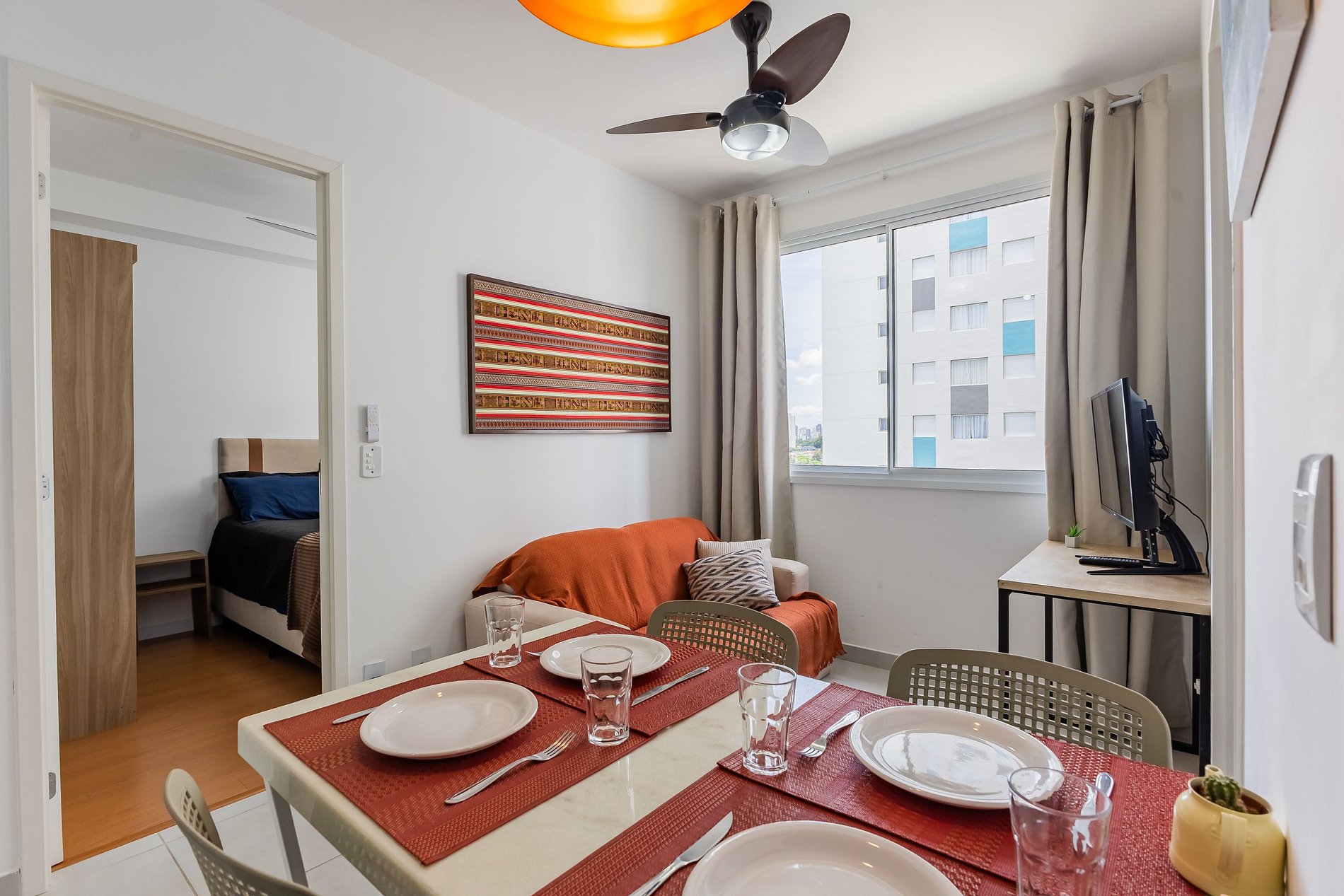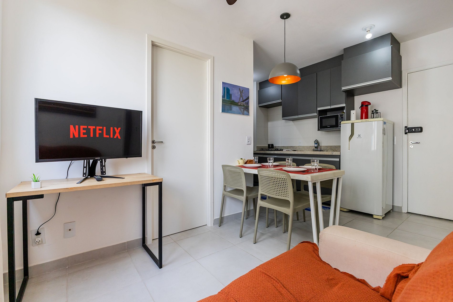 CHECKIN 16H. CHECK OUT 11H. Nosso espaço conta com Cozinha Completa, Sala com TV de tela plana onde podem acessar diversos streamings com suas senhas, 1 suíte americana com cama de casal, armário e banheiro completo com um chuveiro de água forte e aquecida + Segundo quarto com bicama e uma bela vista. Internet ultra rápida (1 Gb). Ventilador de teto em todos ambientes. Oferecemos ammenities de banho, secador de cabelo, ferro de passar roupa.
